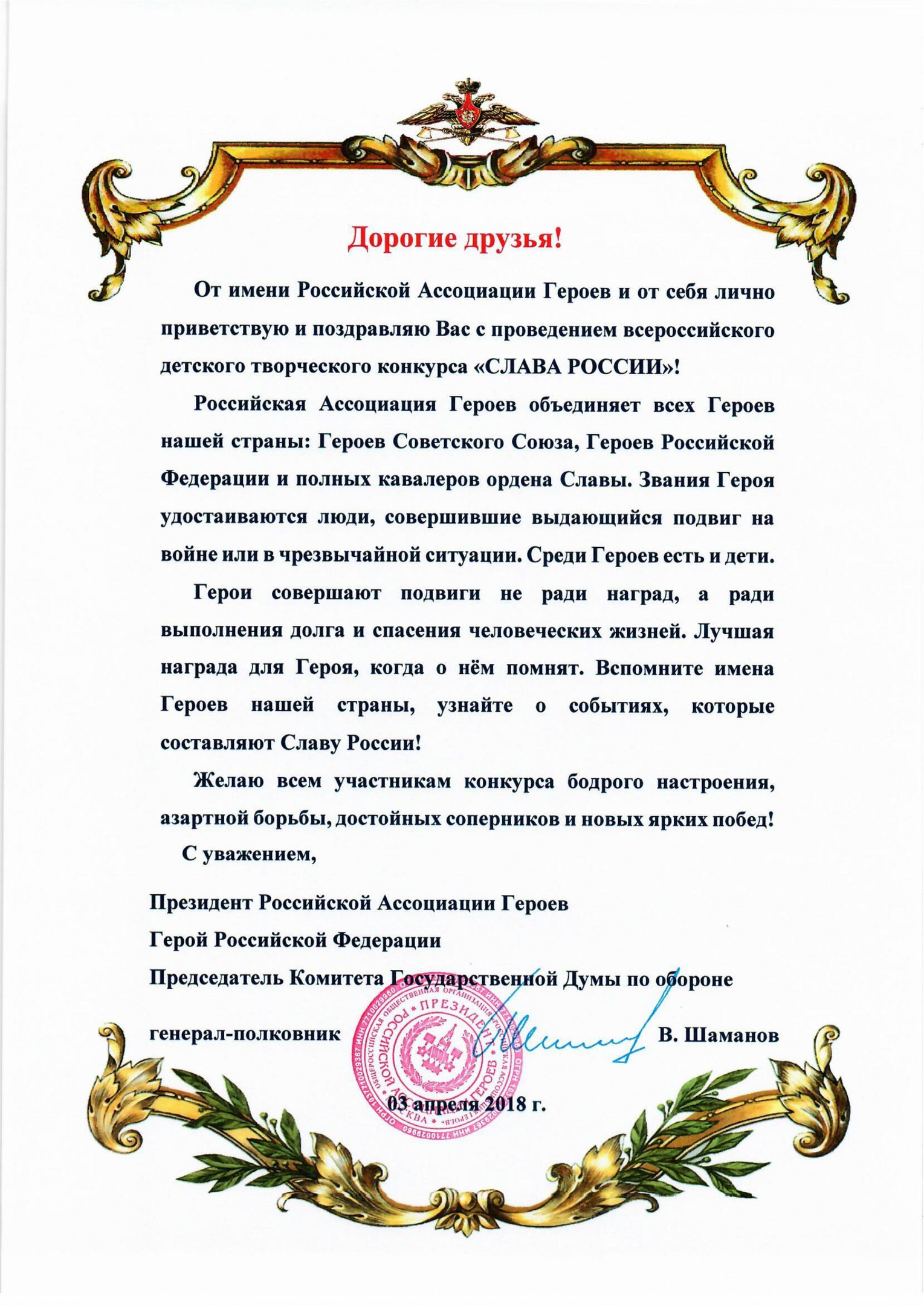 Президент Российской Ассоциации Героев, Герой Российской Федерации, генерал-полковник Владимир Анатольевич Шаманов